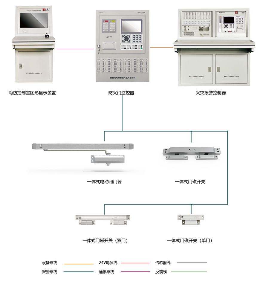 尼特防火门监控系统分为“二线制”解决方案和“四线制”解决方案,系统符合国家标准 GB29364-2012《防火门监控器》,采用 FT-BUS 全数字总线技术,主机自带 63 点总线 控制盘;单机容量 2000 点,可通过 CAN 总线实现 200 台主机联网;门磁开关和电动闭门器采用两总线工作方式。 系统可通过 RS485 接口与消防控制室图形显示装置连接,具有高可靠性和广泛的工程适应性。