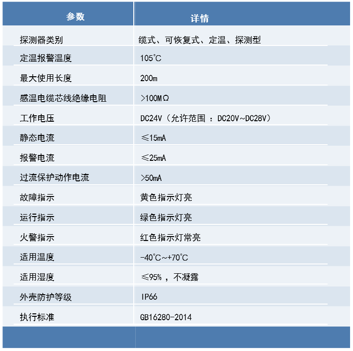 探测器的感温电缆为温度敏感元件,JTW-LD-DT8105感温电缆由两根热敏绝缘材料线芯绞合而成,能够对沿着其安装长度范围内任意一点的温度变化进行探测(最短报警长度1米),当温度上升至响应值时,感温电缆线芯间的阻值跃变,信号处理器随时检测感温电缆线芯间电阻状态,做出火警判断。