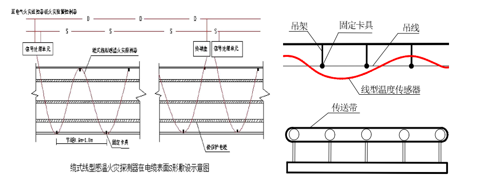 线型感温火灾探测器可以采用正弦波接触式敷设或直线悬挂敷设。其中接触式又可采用正弦波平铺、环绕或直线铺设等方式,使线型温度传感器与被保护对象有尽可能多的接触面积,增加系统的可靠性。悬挂式将线型温度传感器用固定支架悬挂在被保护对象的周围,具体安装见图: