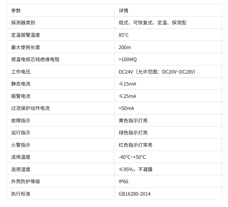 探测器的感温电缆为温度敏感元件,JTW-LD-DT8085感温电缆由两根热敏绝缘材料线芯绞合而成,能够对沿着其安装长度范围内任意一点的温度变化进行探测(最短报警长度1米),当温度上升至响应值时,感温电缆线芯间的阻值跃变,信号处理器随时检测感温电缆线芯间电阻状态,做出火警判断。