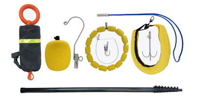 适用于救援人员发现落水和遇险被困人员后,在岸上或船上开展远距离安全施救;整套产品至少包含救生杆、浮球、浮力圈、单钩、挂钩、弧形钩;