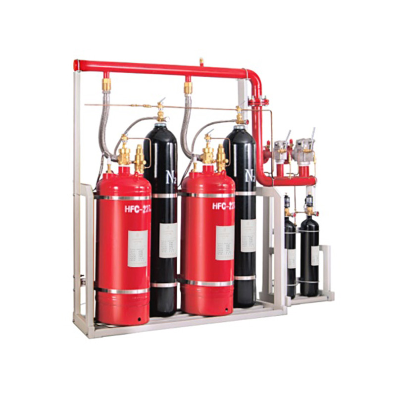 外贮压式七氟丙烷灭火系统是将七氟丙烷灭火剂以液态贮存于容器内,不采用氮气加压,贮存压力仅为灭火剂的饱和蒸汽压力,而作为灭火剂喷放动力的压缩气体则以较高的压力贮存在另外的容器内。系统工作时,高压动力气体通过减压阀减压后注入灭火剂贮存瓶中(同时容器瓶瓶头阀被打开),动力气体推动灭火剂(通过虹吸管、瓶头阀)沿管网系统高速向前运动、在防护区喷头处实施喷放灭火。由于灭火剂和动力气分别贮存于不同的容器可以解决两个方面的问题: -是灭火剂贮存时没有和氮气接触,不会因采用氮气增压而产生气体溶解于灭火剂中;二是在系统启动后,灭火剂输送和喷放过程中的压力始终高于其贮存压力,不会出现灭火剂蒸汽和氮气析出的现象,有效地缓解了灭火剂在输送过程中双相流现象的产生。所以,灭火剂在输送过程中流态稳定,动力气体始终处于灭火剂的末端,推动液态的灭火剂在管路中以单相流体形式快速运动,其速度要比贮压式系统快且稳定,大大提高了管道输送灭火剂的能力,从而延长了输送距离,提高了灭火剂的喷放压力,实现了使用更细的管道输送更多的灭火剂。