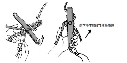 1.人体悬挂时用一只手抓住缓降器扶手环,另一只手调节缓降器手柄,以控制下降速度;