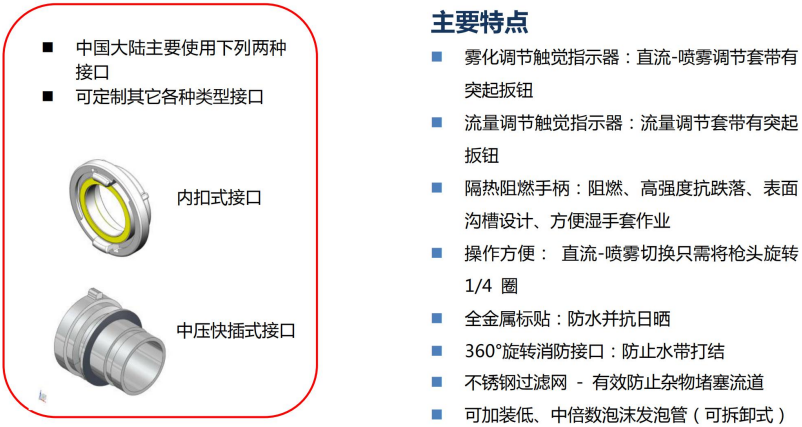 接口选配:1.5 寸、2 寸、2.5 寸可选, 接口类型:内扣式、中压快插式 360° 防水带打结可选。