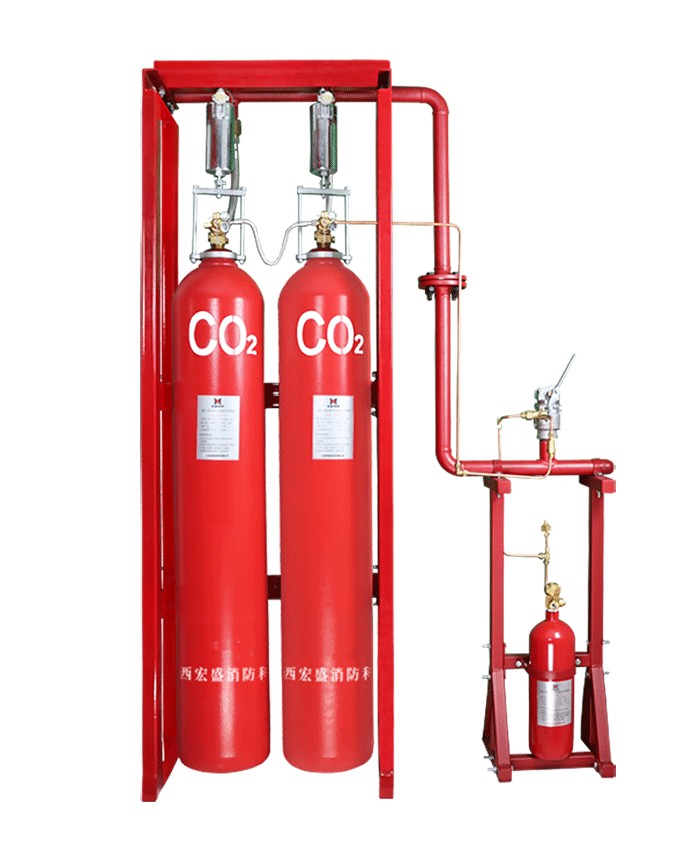 高压二氧化碳灭火系统由瓶组架、灭火剂瓶组、检漏装置、容器阀、金属软管、单向阀(灭火剂管路)、集流管、安全泄放装置、选择阀、信号反馈装置、灭火剂输送管道、喷嘴、驱动气体瓶组、电磁型驱动装置、驱动管道、单向阀(驱动气体管路)等组成,是一种智能型自动灭火设备。根据不同应用场所使用要求,可组成单元独立系统、组合分配系统,采用全淹没灭火方式,实现对单防护区和多防护区的灭火保护,技术先进、灭火效率高、维护方便。设备具有自动、手动和机械应急操作三种启动方式。