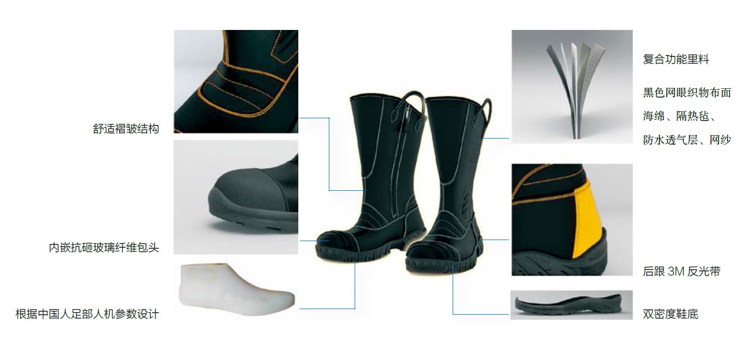 根据中国人体参数设计鞋型,采用双密度模压结构,皮革面料加功能里层,内嵌抗砸玻璃纤维包头,并有舒适褶皱结构,使其功能技术指标符合标准要求,还具有普通橡胶靴不具备的柔软、轻便、透气的产品特点,是消防靴的一次革命。是国内首家通过GA6-2004 标准检测产品。