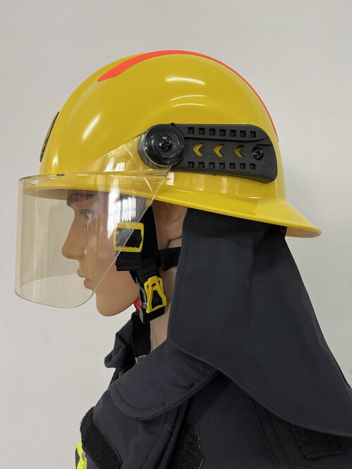 1.消防头盔由盔壳、滑轨、缓冲层、舒适衬垫、佩戴装置、面罩、披肩等组成;
