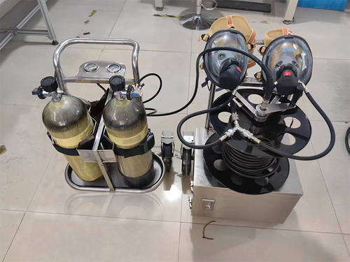 组成部分:气瓶、导气长管卷筒及携带箱、气源分配器、减压器、高压压力表、中压表、压力报警器、供气阀、全面罩2个及腰带2根、Y型转换接口2个、2根10米中压导管。