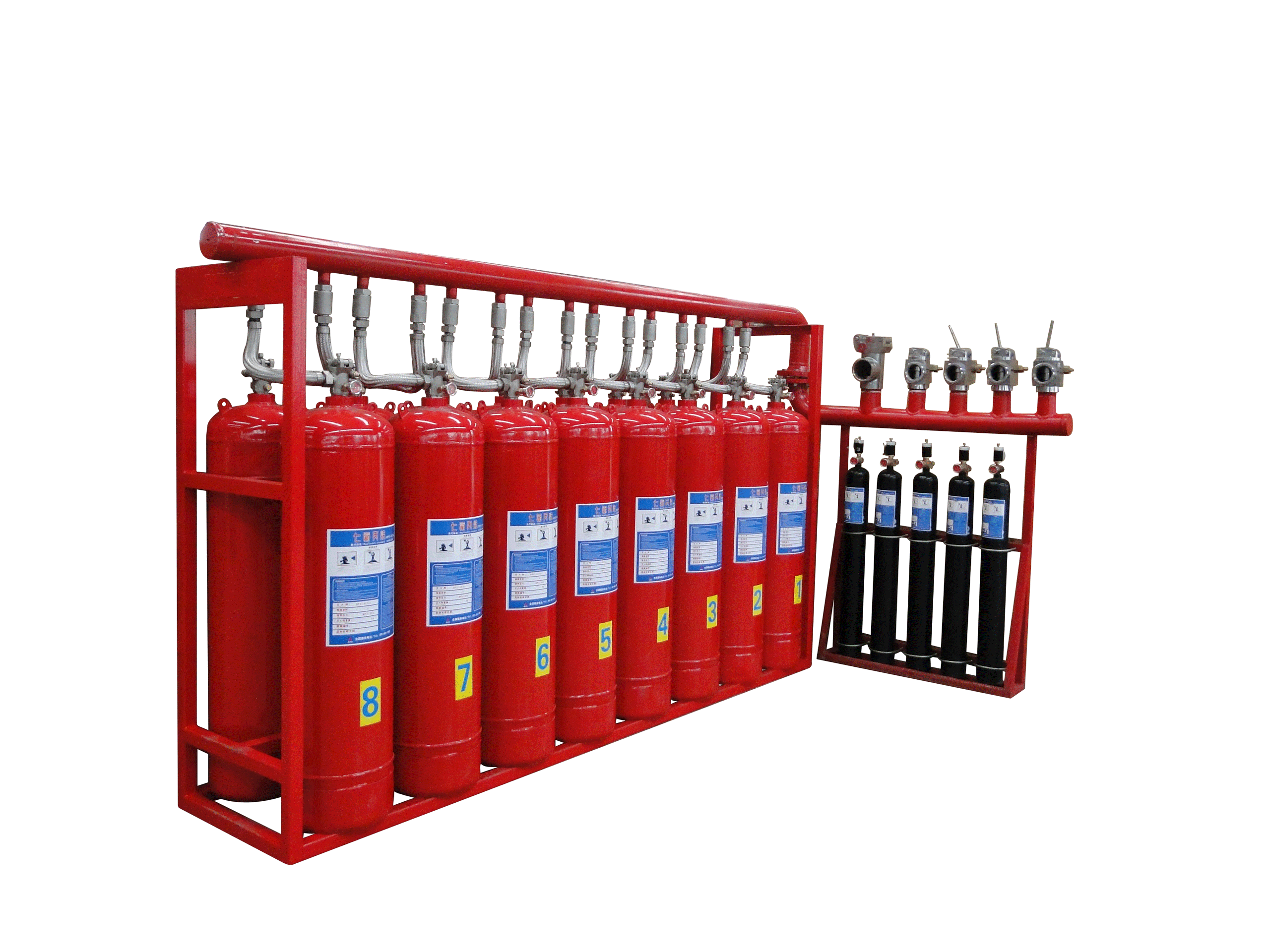 7、可根据用户或项目需求,定制配置设备控制系统,对灭火剂储量、驱动气体瓶组压力、释放阀门动作状态以及设备的释放压力等数据进行监测、采集、记录,便于火灾或设备故障的事故分析。