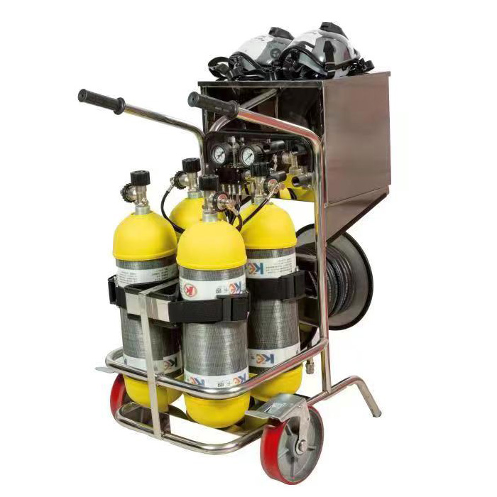 2、由车载式整体不锈钢气瓶推车、6.8L碳纤维气瓶+橡胶护套、高压胶管、气源分配器、减压器、压力表、报警器、中压长管、Y形快接、气体分流管、供气阀、面罩和辅助腰带组成。是将新鲜空气输送到有毒有害工作环境下供工作人员使用的呼吸装备。