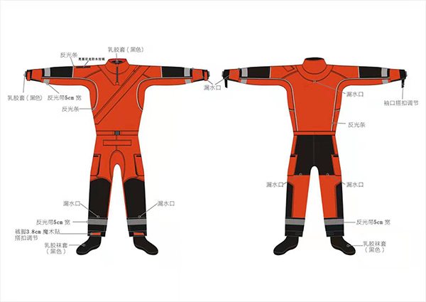 (2).衣领处有反光嵌线及透水网,正前方为斜向防水拉链,袖口、领口魔术贴束紧带设 计,(用于调节至舒适度)。领口、袖口均使用全防水密封圈,防水效果佳;腰部有弹性松紧带设 计,(用于调节至舒适度)小腿部和手臂处设有环状反光条,(提高夜间救援360°可视度)。内置可拆卸背带,可调节;