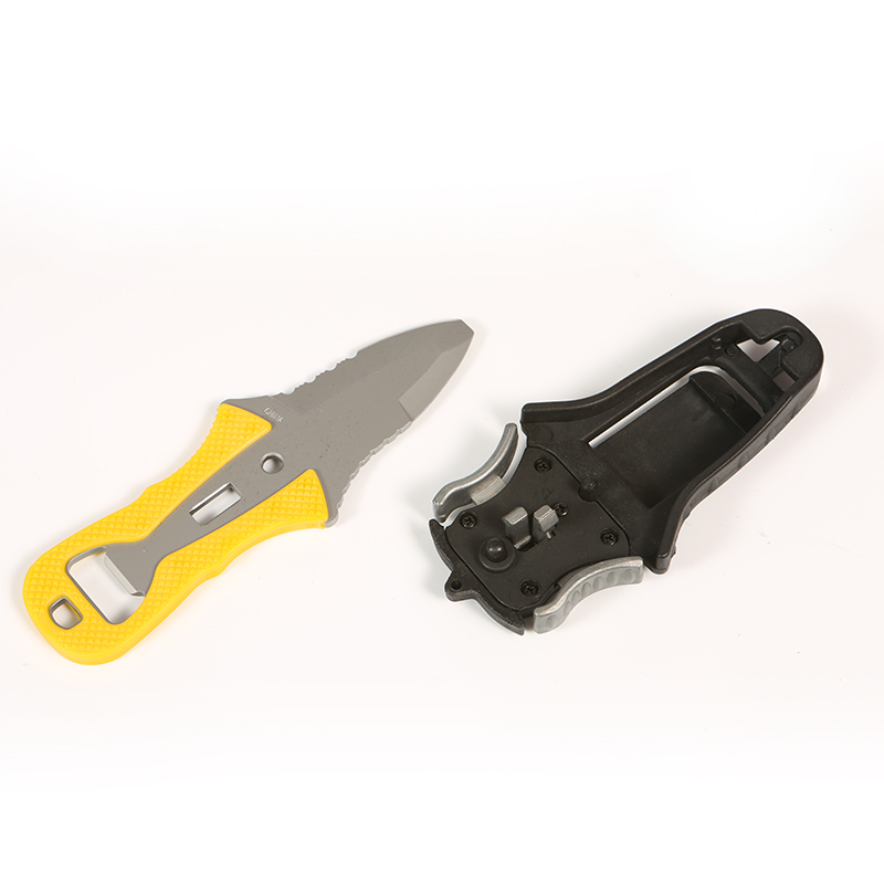 (6).护套材料:增强尼龙玻璃纤维具有耐磨,弹性性能。卡扣弹簧为316弹簧,不易生锈。刀鞘采用 释放扣双侧安全开关大按键,快速释放设 计,保证使用快速取放及牢固性;刀鞘可固定于救生衣使用。