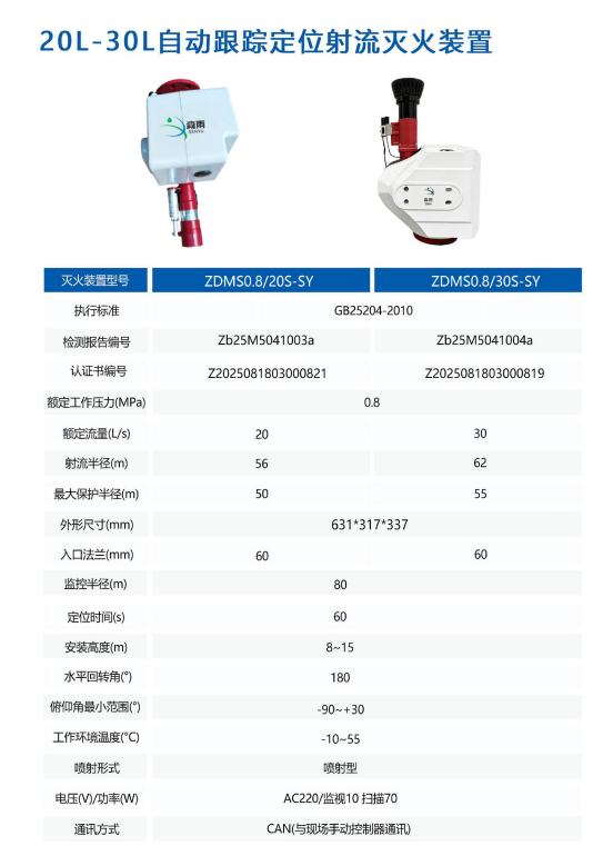 自动跟踪定位射流灭火装置20-30L自动跟踪定位射流灭火装置(消防水炮)是我司核心产品,聚焦大空间消防需求,搭载先进智能传 感与计算机控制技术,凭借20-30L流量优势,实现早期火源快速探测、精准定位与高效扑救,守护各类开阔空间安全。专为物流仓储、大型厂房、交通枢纽、体育场馆等大空间量身定制,针对其跨度大、层高足、火源易蔓延的特点,以最优流量兼顾灭火强度与覆盖范围,破解大空间消防痛点。系统融合多光谱探测与智能算法,提升大空间火源别准确率与响应速度,自动完成灭火全流程,大幅低火灾风险与财产损失。同时支持定制化配置,可根 据不同大空间场景需求灵活调整,提供针对性消防解决方案。