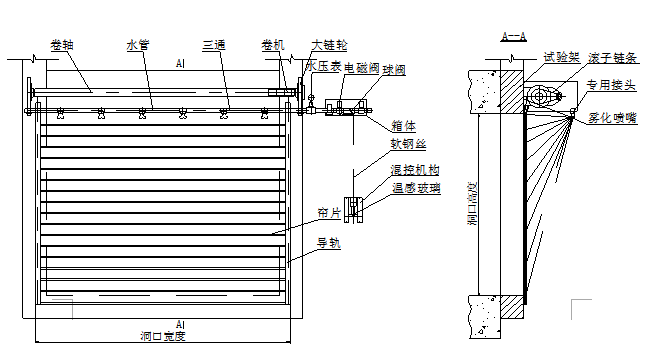 产品是用切向旋涡式的喷头,将水雾化到0.1mm左右的水滴,喷向卷帘帘面,对卷帘帘面实行强制冷却,与普通钢质防火卷帘在卷帘两侧加独立的封闭式自动喷水系统相比,可节约了用水量。