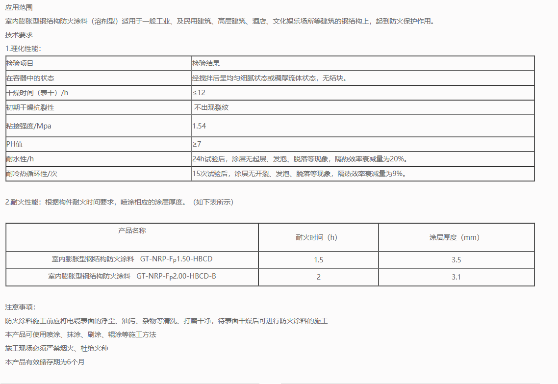 室内膨胀型钢结构防火涂料(溶剂型)过火时形成均匀而致密的蜂窝状或海绵状的炭质泡沫层,对可燃性基材有良好的保护作用。该种涂料耐水、防潮、防霉、防虫等性能比较优异,适合于较潮湿的地区和相应的部位使用。涂层的光泽度较好,具有较好的附着力、良好的成膜性能,硬度大、耐洗刷性、耐玷污性。