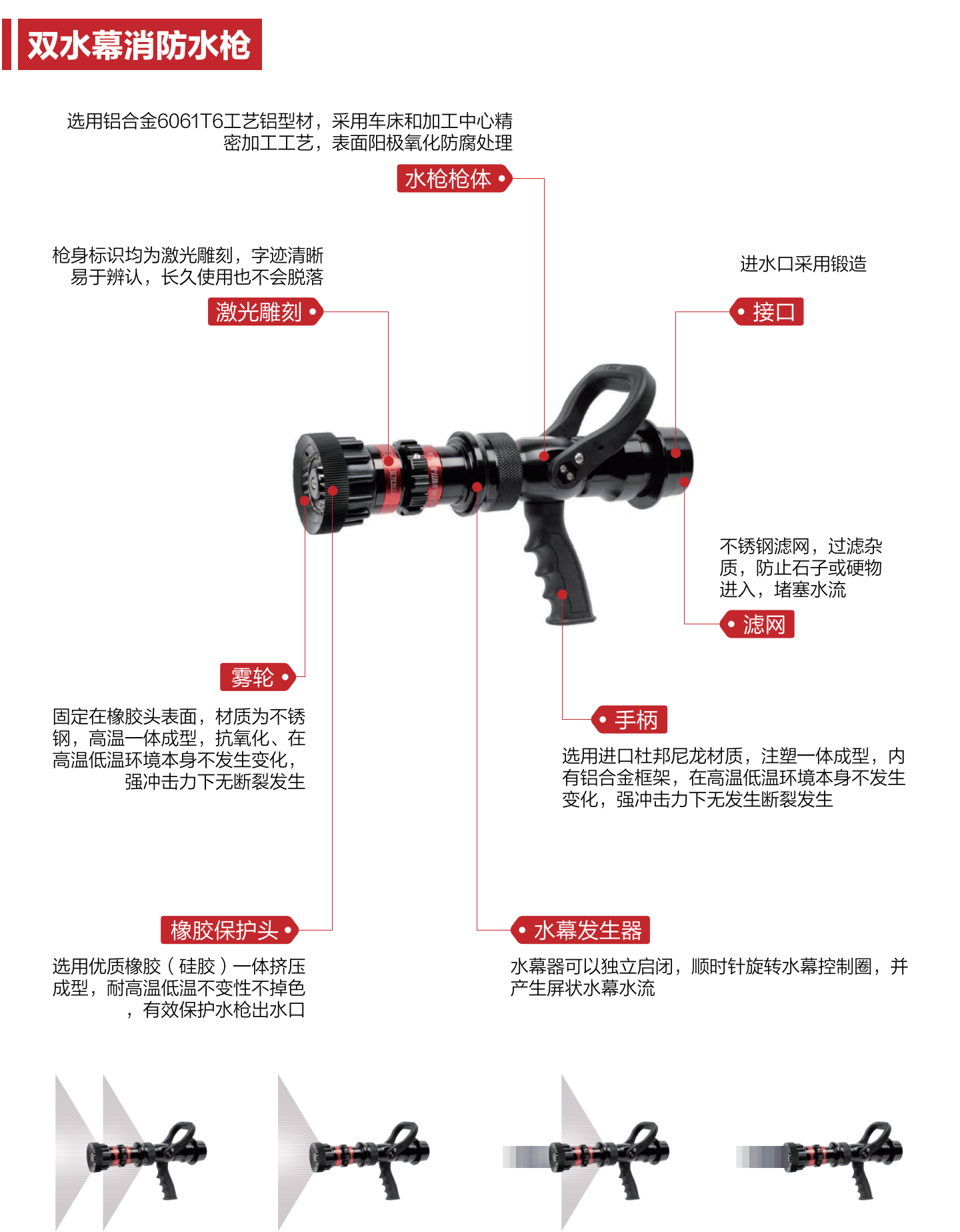 综合直射和屏状雾射模式,能够在喷射柱状水流的同时能喷成独立伞形水幕或两个水幕功能,水幕器设置用于保护人及财产的安全之目的,使消防人员能进–步接近热辐射提高灭火效果。