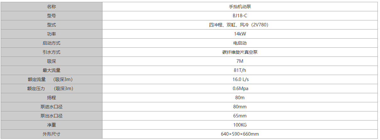 采用25HP双缸柴油机,额定流量16L/s,额定压力0.60MPa,电启动,最大流量81T/h,扬程80m,真空泵引水,进水口80mm,出水口65mm