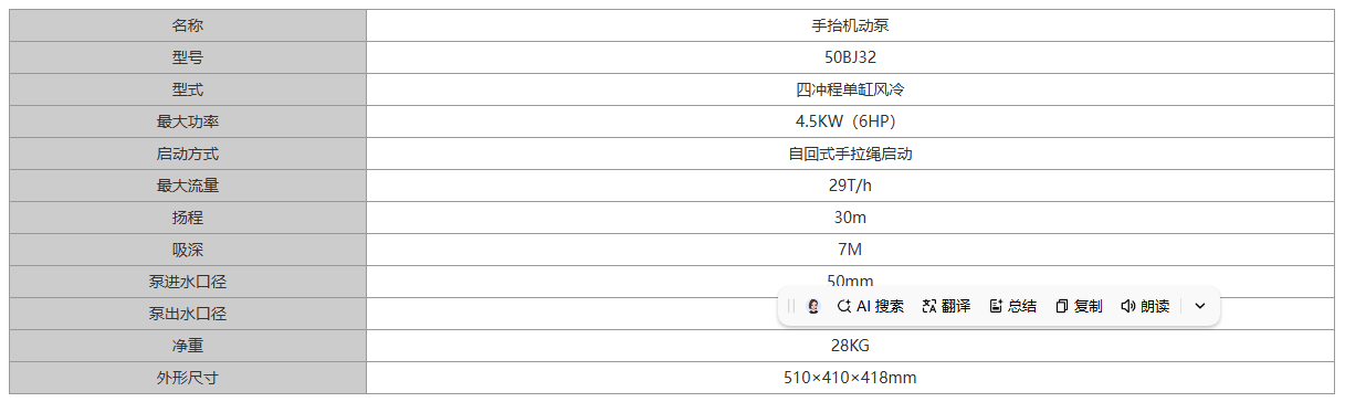 采用宗申6HP单缸汽油机,手启动,最大流量29T/h,扬程30m,进水口50mm,出水口50mm,重量28KG