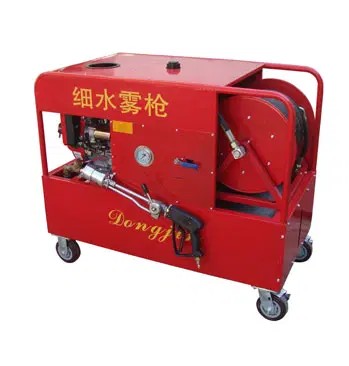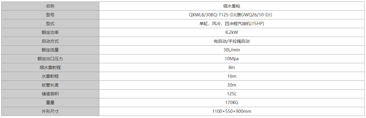 细水雾枪(移动式高压细水雾灭火装置),风冷四冲程单缸汽油机,功率8.2kW(15马力),额定流量30L/min,电启动/手拉绳启动,额定出口压力10MPa,水雾射程16m,细水雾射程8m,水箱容积125L,软管长30M