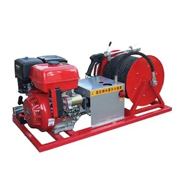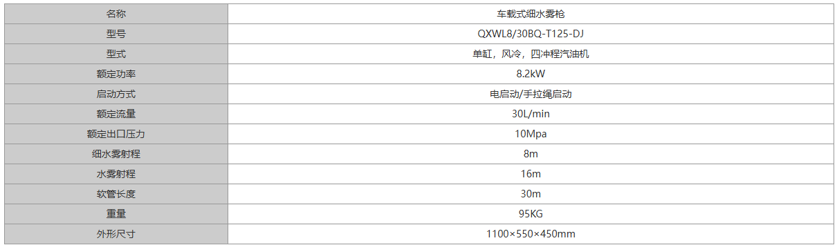 车载式高压细水雾灭火装置,风冷四冲程单缸汽油机,功率8.2kW(15马力),额定流量30L/min,电启动/手拉绳启动,额定出口压力10MPa,水雾射程16m,细水雾射程8m,软管长30M