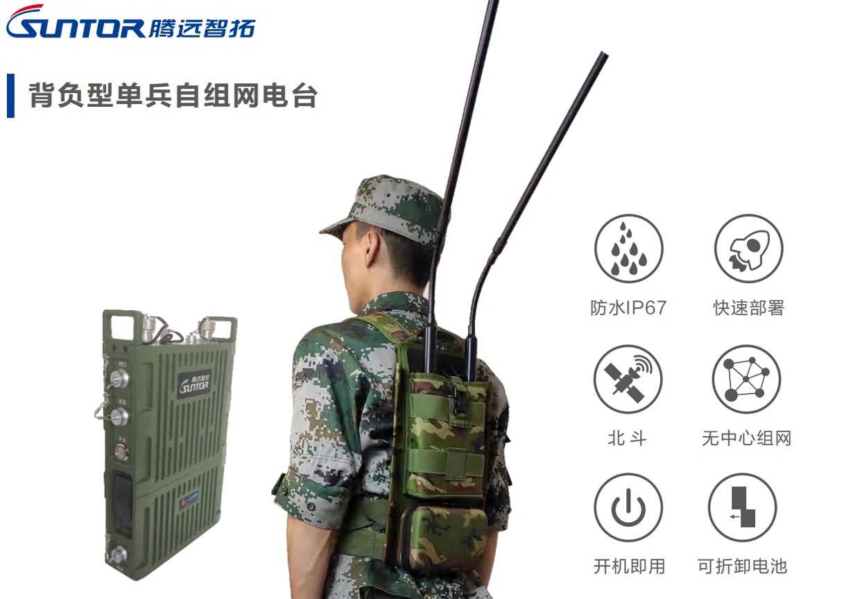 背负式自组网电台:体积小、重量轻,配备高容量可拆卸锂电池,便于单兵背负携带,充分的解放双手。