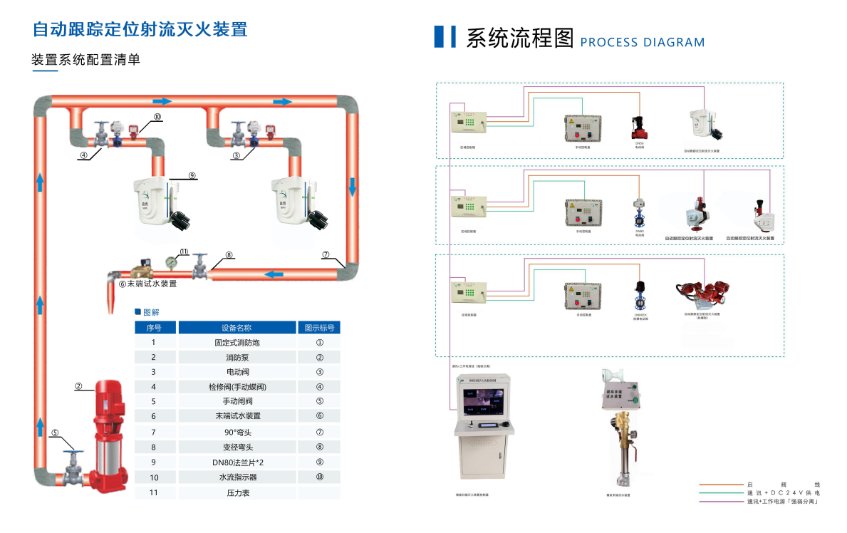 原理:通过探测装置感知火灾,自动瞄准火源,再经供水设备喷水灭火。